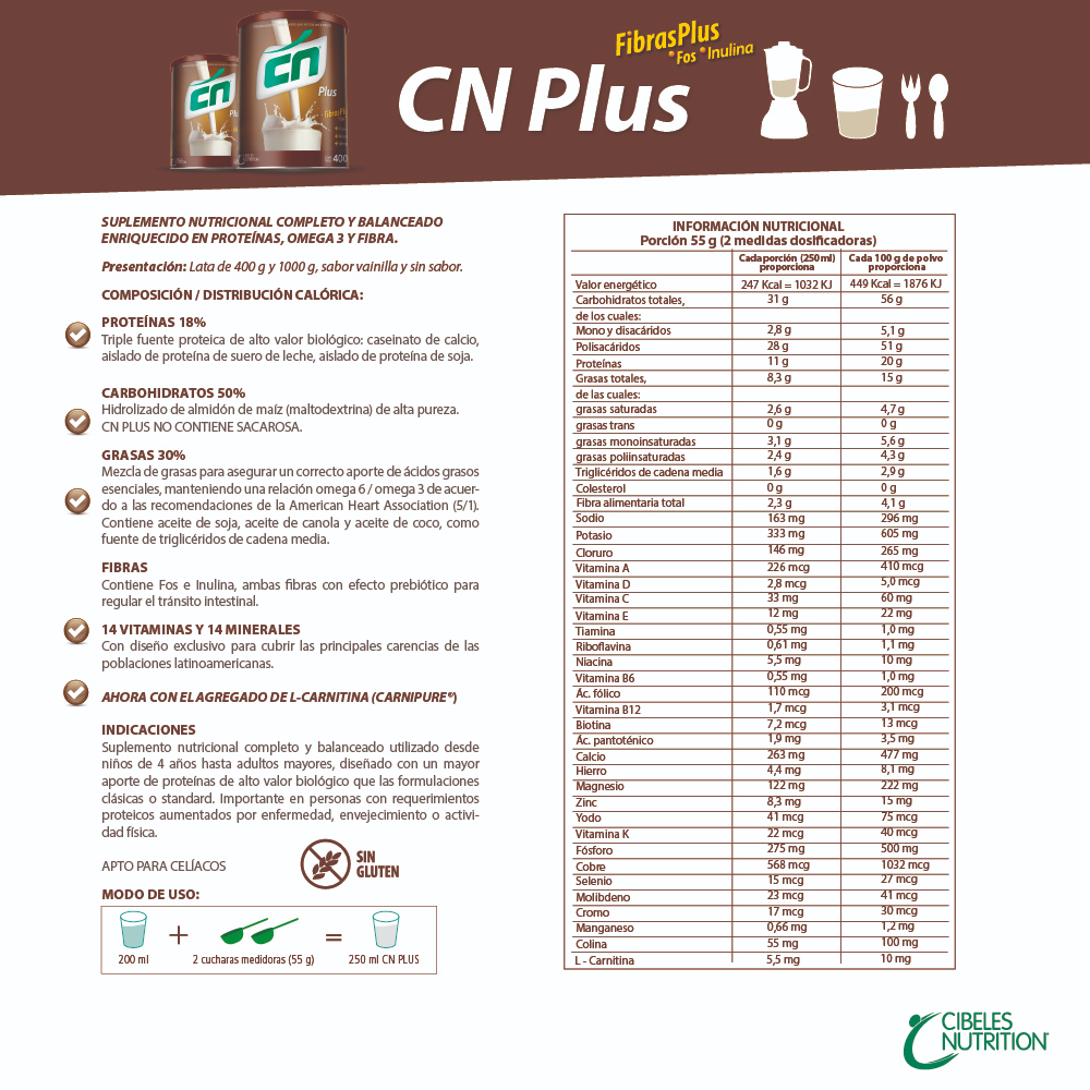 CN Plus Cibeles Sabor Vainilla 1000 g es un suplemento nutricional versátil formulado para complementar la dieta y cubrir requerimientos nutricionales aumentados en personas con mayor demanda de energía o proteínas, como niños a partir de 4 años, adultos mayores y personas activas. Su fórmula completa está diseñada con proteínas, Omega 3, fibra (FOS e inulina), 14 vitaminas y 14 minerales, que ayudan a mantener niveles adecuados de energía, promover una buena función metabólica y favorecer la salud general.