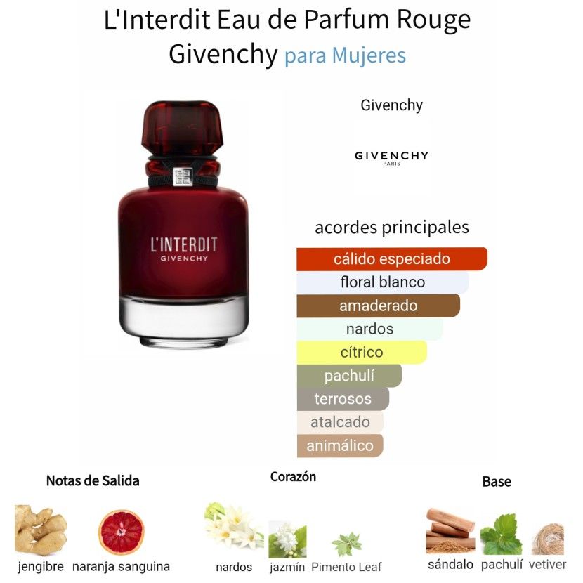 Givenchy L’Interdit Rouge es una fragancia femenina que encarna audacia, elegancia y seducción. Su aroma combina notas florales intensas con matices amaderados, creando una esencia profunda, sofisticada y duradera.