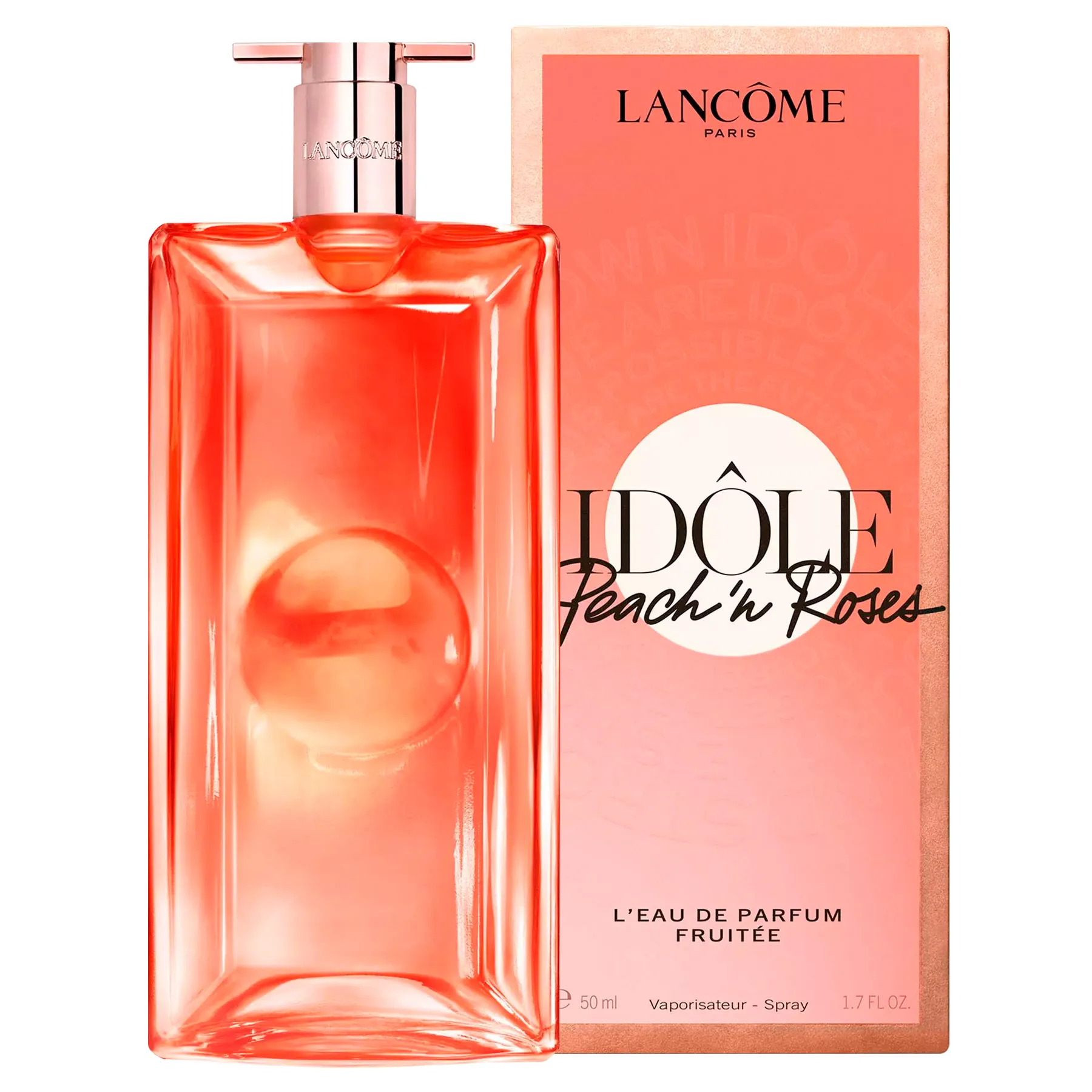 Lancome Idôle Peach’N Roses Eau de Parfum 50 ml: fragancia floral-frutal con frutos rojos, melocotón y rosa damascena. Dulce, fresca y femenina, ideal para destacar cada día.