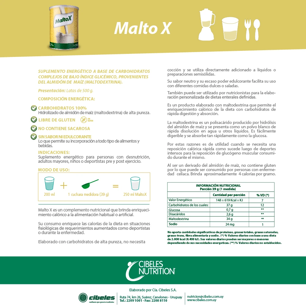 Maltox Cibeles 500 g es un suplemento nutricional en polvo formulado con maltodextrina de alta pureza —un carbohidrato complejo derivado del almidón de maíz— que se disuelve fácilmente en agua o cualquier bebida sin alterar su sabor. Este producto está diseñado para incrementar el aporte energético diario, especialmente en casos de desnutrición, recuperación, esfuerzo físico intenso o mayor gasto calórico, ya que proporciona una fuente de energía de absorción rápida y de bajo índice glucémico que apoya el rendimiento y la recuperación muscular.