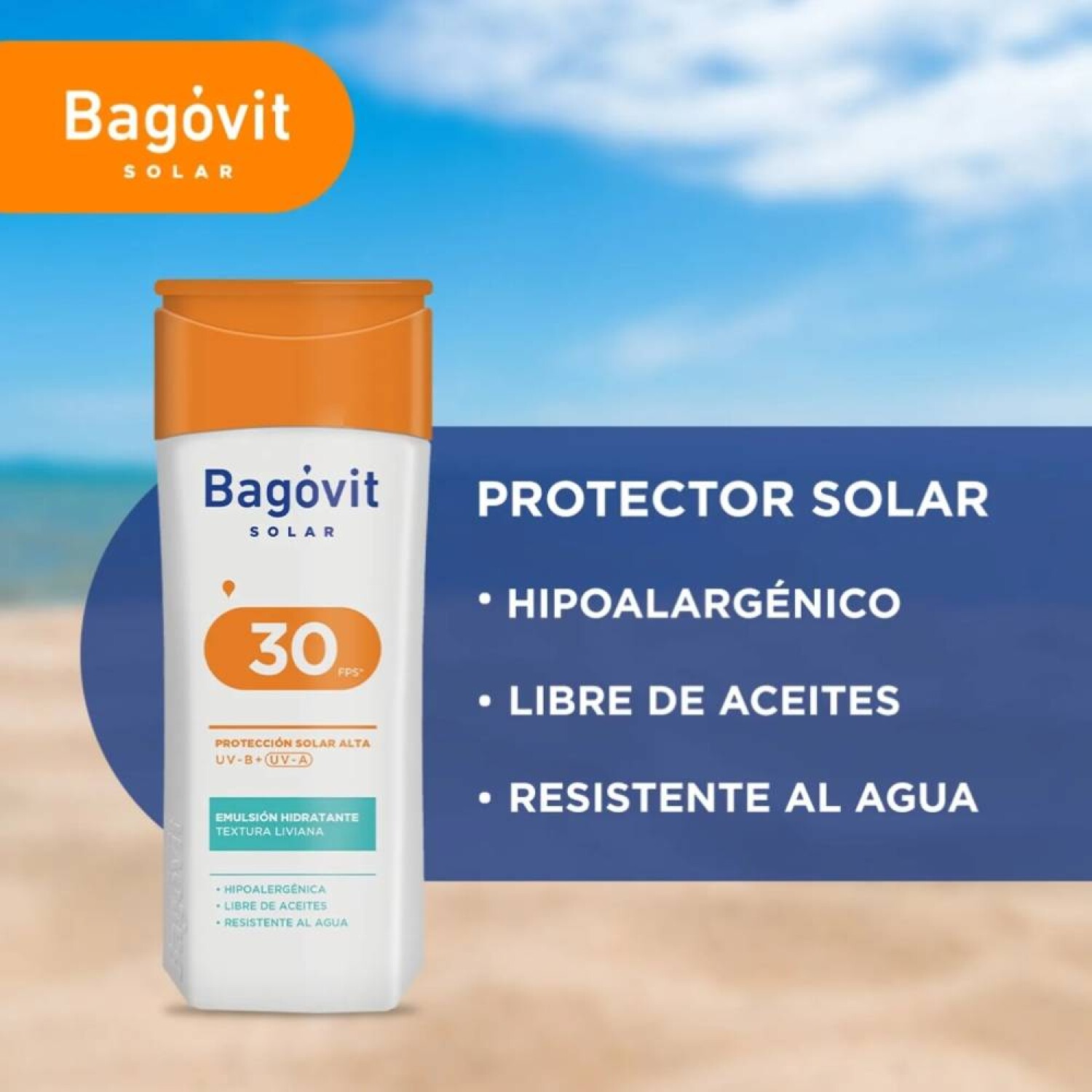 El Protector Solar Bagovit Family Care FPS 30 200 g es una emulsión solar de amplio espectro que protege tu piel de los rayos UVA y UVB, hidratándola y cuidándola con vitaminas y una textura ligera, ideal para toda la familia.