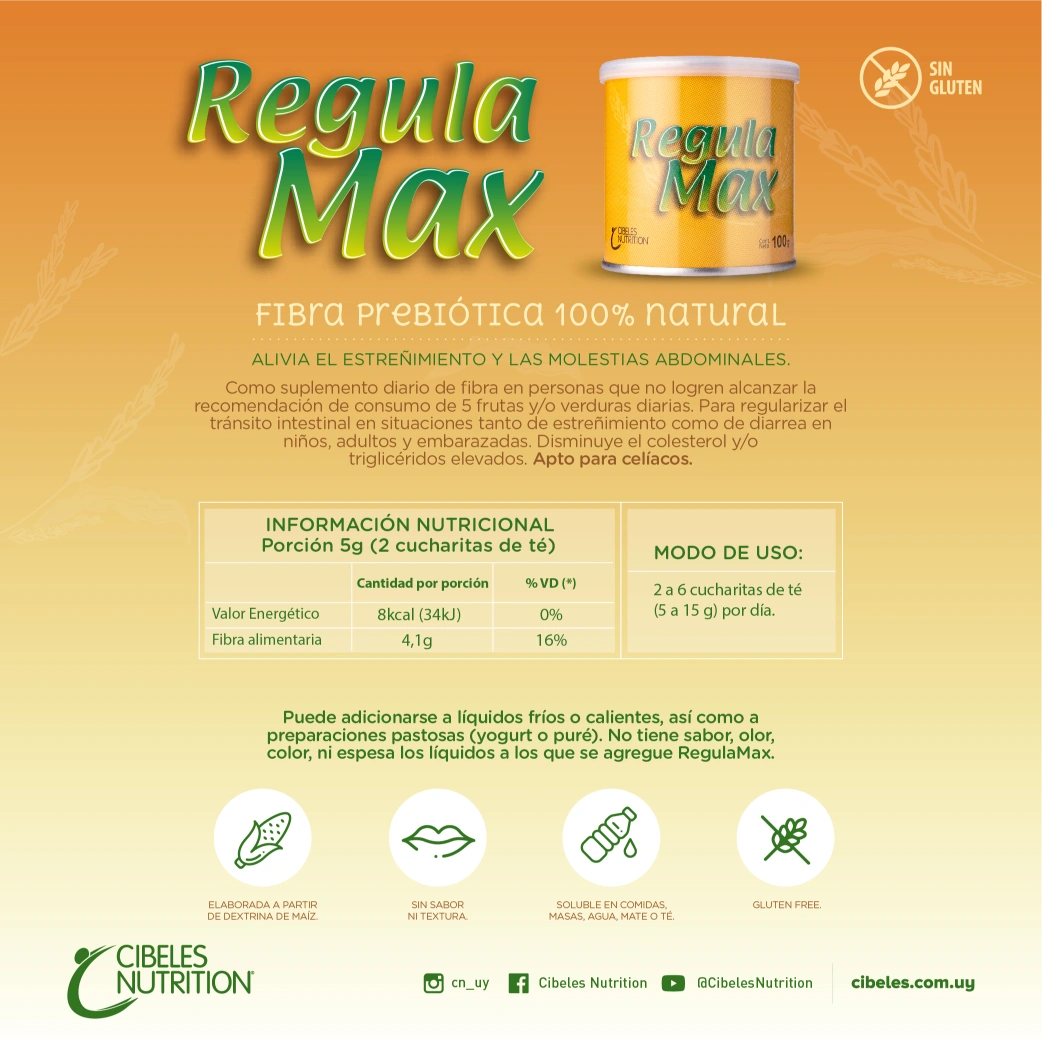 RegulaMax 100 g es un suplemento de fibra prebiótica soluble en polvo que ayuda a regular el tránsito intestinal, mejora la digestión y contribuye al bienestar general sin alterar el sabor de los alimentos ni bebidas.
