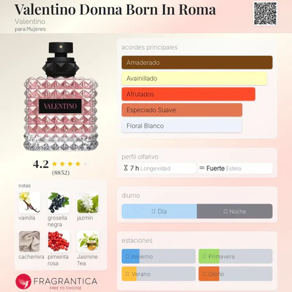 Valentino Born In Roma Donna Eau de Parfum 100ml es un perfume que celebra la individualidad y el estilo contemporáneo de la mujer. Inspirado en la ciudad eterna, combina la delicadeza de las flores con la intensidad de la vainilla bourbon, creando un contraste único entre frescura y sensualidad.