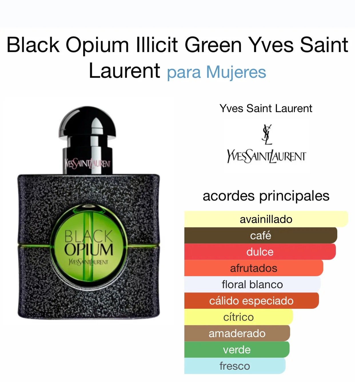Black Opium Illicit Green de Yves Saint Laurent es una fragancia femenina intensa y adictiva, con un giro fresco y vibrante que realza su carácter sensual y moderno.